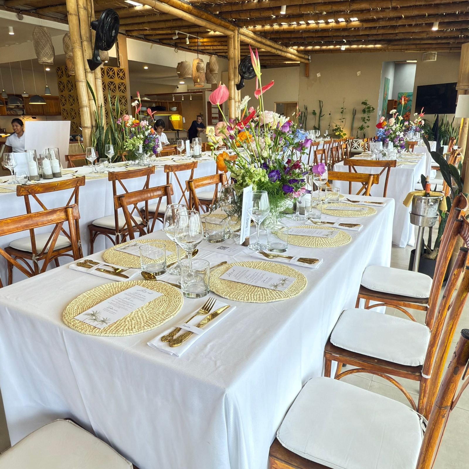 •Montaje, mobiliario, vajilla y decoración floral